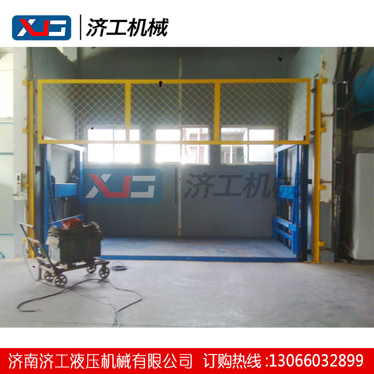 濟工導(dǎo)軌式油壓升降臺安裝現(xiàn)場,可根據(jù)客戶要求加裝不繡鋼轎廂,加裝電動卷簾門或者電梯門